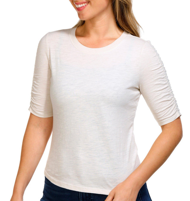 Add a graceful touch to your wardrobe with this Womens Ruched Ballerina Short Sleeve Top. Made from 100% cotton, it features a soft heathered finish, flattering crew neckline, and delicate ruched detailing on the short sleevesperfect for a casual yet feminine look.