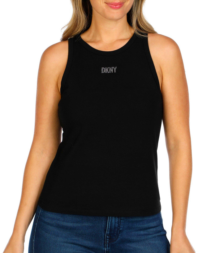 This sleeveless tank adds a touch of sparkle to everyday style. Crafted from soft, breathable fabric, it features a rhinestone stud logo that catches the light with every move. Perfect for layering or wearing solo, this tank blends casual comfort with a hint of glam. Fabrication is 95% cotton, 5% spandex.
