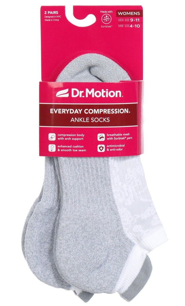 Dr. Motion women's compression ankle socks in grey come in a 2-pair pack, sized for sock size 911 and shoe size 410. These socks feature a compression body with dynamic arch support, enhanced cushioning, and a smooth toe seam. Made with breathable mesh and Sorbtek yarn, they wick moisture and offer antimicrobial and anti-odor protectionperfect for everyday comfort and support.
