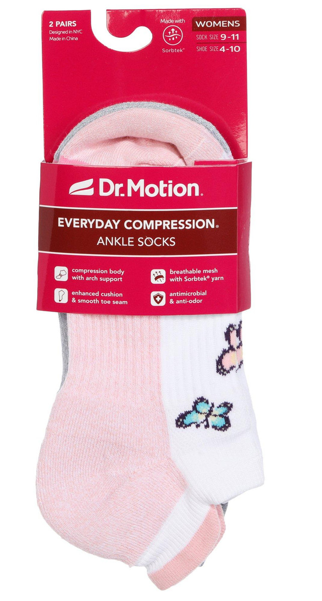 Dr. Motion women's compression ankle socks come in a 2-pair pack (grey and pink with butterfly design), sized 911 sock and 410 shoe. Features include 360° compression, arch support, breathable mesh with wicking yarn, antimicrobial and anti-odor tech, ankle tabs with reflective logo, Y-heel fit, cushioned cotton heel/toe, and reinforced smooth toe. Fabric: 50% Nylon, 29% Cotton, 13% Polyester, 8% Spandex.
