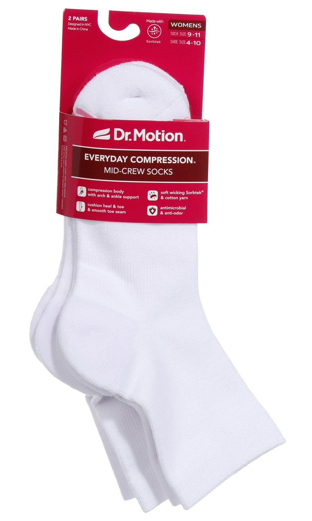 Dr. Motion women's compression mid-crew socks come in a 2-pair pack in classic all white. Sized 911 sock and 410 shoe. Features include 360° compression, arch support, breathable mesh with wicking yarn, antimicrobial and anti-odor tech, ankle tabs with reflective logo, Y-heel fit, cushioned cotton heel/toe, and reinforced smooth toe. Fabric: 50% Nylon, 29% Cotton, 13% Polyester, 8% Spandex.