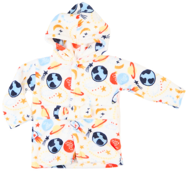 Keep your baby warm and snug with the Baby Outer Space Plush Bath Robe. It features an allover pattern with rockets, stars and planets on ultra soft plush fabric, complete with an attached hood and adjustable belt for a secure fit. Ideal for post bath routines or cozy lounging. Machine wash cold for easy care. Fabrication is 100% polyester.
