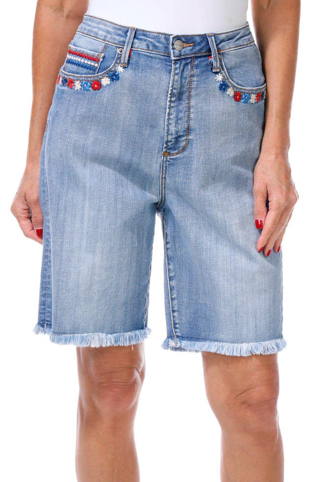 These long denim shorts feature a classic blue wash with a comfortable stretch fabric for easy movement and all-day wear. The front pockets and embroidered back pockets showcase a festive, patriotic USA flag design reimagined in vibrant floral embroidery, adding a playful and unique twist. Perfect for summer celebrations, these shorts blend casual style with standout detail.