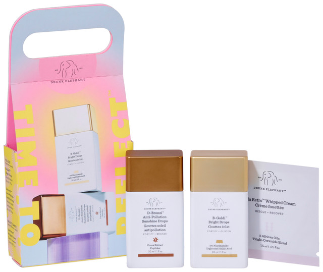 Time to Reflect is a vibrant skincare trio designed to deliver glow, brightness, and hydration in one compact set. It features anti-pollution drops that add a sun-kissed tint while defending against environmental stressors, brightening drops that help even out skin tone and boost radiance, and a peptide-rich cream that strengthens and moisturizes the skin.