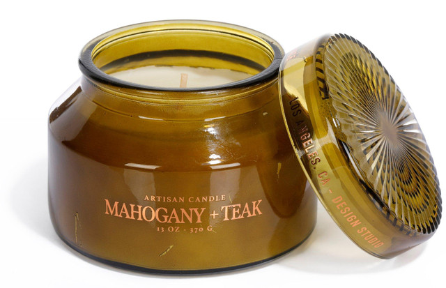 Elevate your space with this 13 oz Mahogany and Teak Artisan Candle, featuring a refined blend of warm wood scents in a beautifully crafted glass holder. Designed with a single wick for an even, clean burn. Ideal for relaxing evenings or adding a sophisticated touch to any room. Trim wick before each use for optimal performance. Measures approximately 4 in x 5 in round.