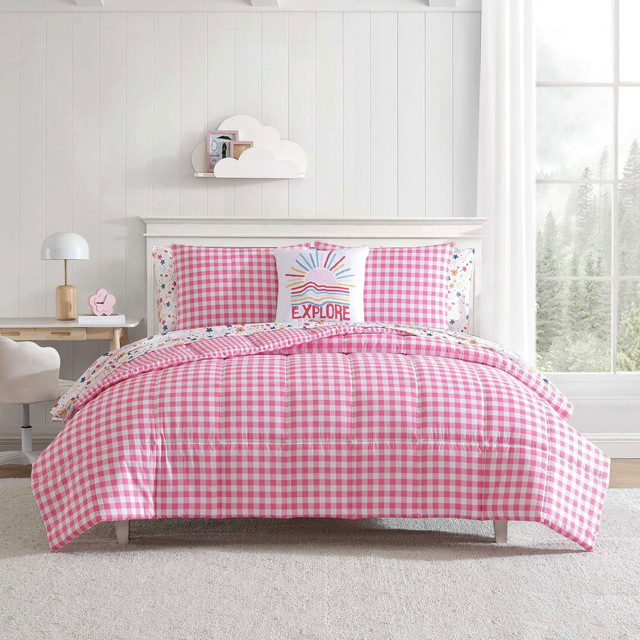 The Eddie Bauer Kids Preston Check Comforter Set is a perfect blend of adventure and comfort for your child's bedroom! It features a classic white and light pink gingham check pattern for a timeless playful touch. The square pillow, with a vibrant explore logo, inspires dreams of sunny days and exploring the great outdoors. The set is OEKO-TEX certified, ensuring it is free from harmful substances, making it gentle and safe for delicate skin. Machine washable for easy care.