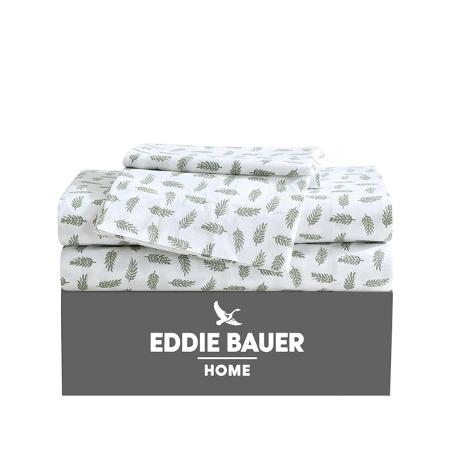 Refresh your space with the Eddie Bauer Laurel Leaves Sheet Set, featuring a delicate leaf pattern inspired by nature. Crafted from crisp, breathable 100% cotton percale, these sheets soften with every wash. The fully elasticized fitted sheet ensures a secure fit, and OEKO-TEX certified dyes offer eco-friendly comfort. Machine washable for easy care.