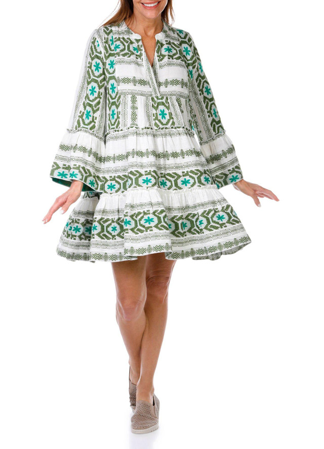 Step out in effortless style with this womens arrow tiered mini dress. Featuring a long sleeve split neckline with snap button closure, a soft knit body, and a flowy tiered skirt, it is perfect for casual days or dressed-up evenings.