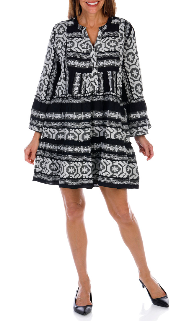 Step out in effortless style with this womens arrow tiered mini dress. Featuring a long sleeve split neckline with snap button closure, a soft knit body, and a flowy tiered skirt, it is perfect for casual days or dressed-up evenings.