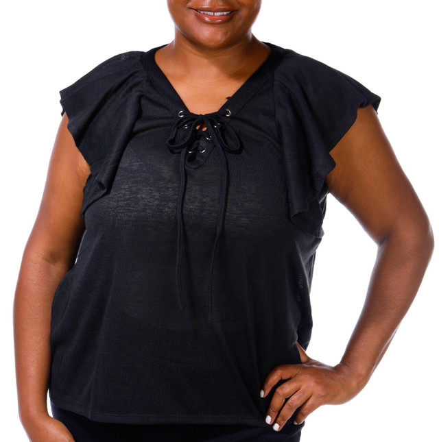 Add a touch of charm to your look with this Plus Flutter Sleeve Lace Up Top. Featuring a solid color, soft flutter sleeves, and a stylish lace-up neckline, its the perfect blend of comfort and feminine flair. Fabrication 100% polyester.