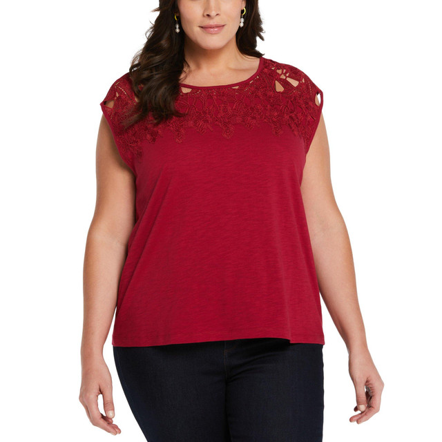 Elevate your wardrobe with this classic cotton tee. Its breathable fabric ensures all-day comfort. The delicate lace adds a touch of femininity, while the solid color pairs effortlessly with any outfit. Experience timeless style with this versatile tee. Measures approx. 26 in. L.