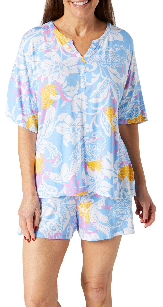 Drift off in style with this 2-piece Sleepwear Set, featuring a pair of comfy shorts and a short sleeve tee adorned with a bright, cheerful print. Designed for ultimate comfort, this set is perfect for warm nights or lounging around the house. The vibrant design adds a fun touch to your nighttime routine, ensuring you look and feel great as you relax. Fabrication is 95% rayon and 5% spandex.