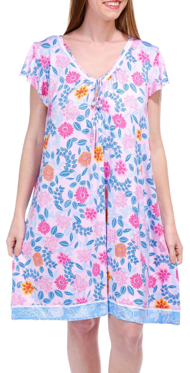 Introducing this charming Short Sleeve Chemise Nightgown, featuring a delightful print that adds a touch of elegance. The tied neckline detail provides a graceful finish, making it perfect for a restful night's sleep or lounging in style. Crafted from soft, breathable fabric, this nightgown ensures you stay comfortable all night long. Fabrication is 95% rayon, 5% spandex.