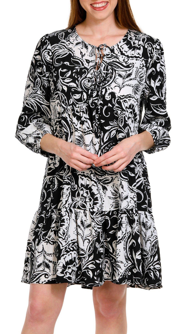 Discover elegance and comfort in one with our Womens Printed 3/4 Sleeve Dress. Featuring a charming tiered skirt and a flattering v-neckline with a delicate tie, this dress is a versatile addition to any wardrobe. Crafted from a soft blend of 88% rayon and 12% nylon, it promises both durability and a gentle touch against the skin. Perfect for both casual outings and special events, this dress is sure to become a cherished staple.