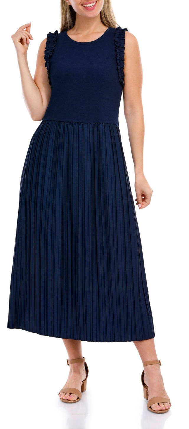 Introducing the Sleeveless Midi Dress, a perfect blend of elegance and charm. This dress features delicate ruffled and pleated details that add a touch of sophistication. The button back neckline offers a unique and stylish element, making this dress ideal for any occasion. Combining practicality with elegance, this sleeveless midi dress is a must-have addition to your wardrobe.