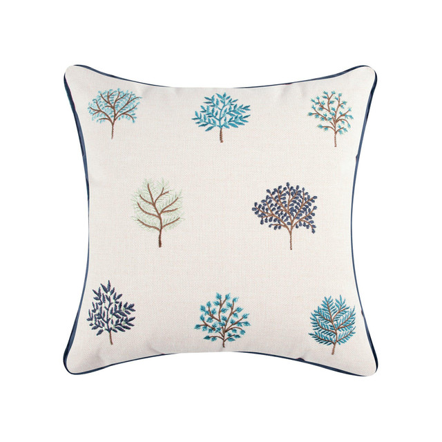 Bring the charm of the forest into your home with the Trees decorative pillow. Featuring embroidered trees in rich blue tones on a warm cream ground, it pairs perfectly with the Levtex Home English Forest Navy collection. With its earthy palette and cozy feather fill, its a natural fit for any cabin-inspired bed, couch, or chair. Measures 16 in. x 16 in.
