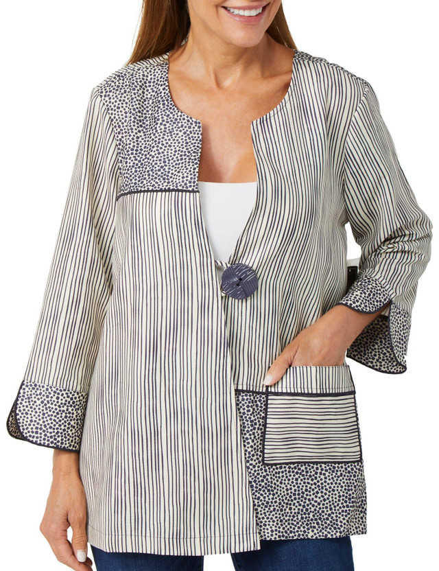 This collarless jacket features quarter-length sleeves and a sleek silhouette. A bold 2-inch button at the front serves as the main closure, adding a stylish focal point. A matching oversized button accents the front pocket, creating a cohesive, fashion-forward look. Perfect for layering, it blends minimalism with statement details for effortless sophistication.