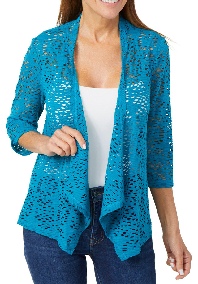 Lightweight and easy to layer, this petite 3/4 sleeve cardigan features a draped open front for a relaxed yet refined look. Perfect for transitional weather, it adds effortless style and comfort to any outfit. Fabrication is 97% polyester and 3% spandex.
