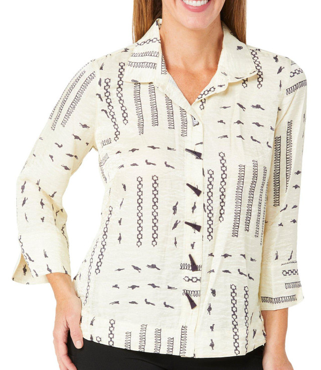 Add polish to any look with this womens button down top featuring silky smooth fabric and a fashionable print. Designed with 3/4 sleeves slit cuffs and eye-catching fashion buttons it blends comfort with elevated style. Perfect for work weekends or travel this top offers a versatile and flattering fit. Fabrication is 80% rayon and 20& nylon.