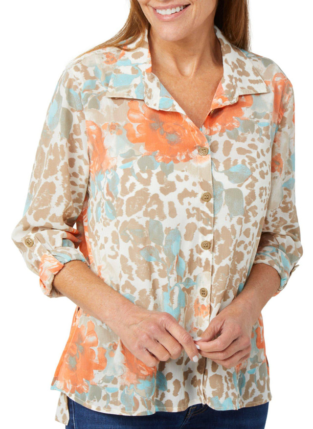 Lightweight and sheer, this petite long sleeve top features a button down front, cuffed sleeves with button accents, and a delicate pattern that adds subtle elegance. Ideal for layering or wearing solo, it offers a breezy feel with a polished finish.