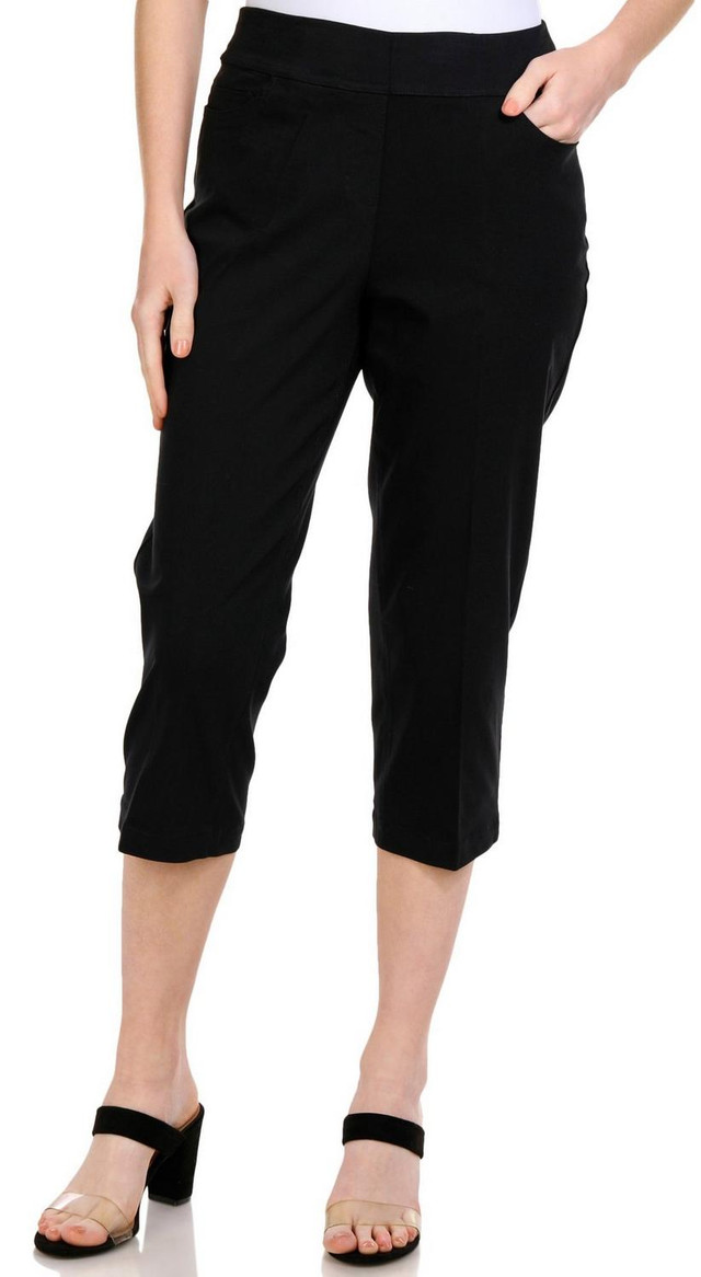 Get ready for any occasion in these stylish Slim Crop Pull-On Capris! They feature a classic 5-pocket design, pull-on styling, and a sleek solid color design. Fabrication is 77% rayon, 20% nylon, and 3% spandex.