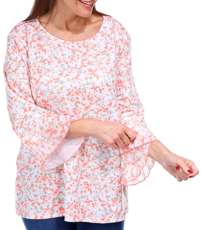 The 3/4 Sleeve Top is a delightful addition to any wardrobe. Featuring charming flounce sleeves, this top brings a playful yet sophisticated touch to your outfit. The print pattern adds a vibrant and stylish element, making it perfect for both casual outings and more polished occasions. Fabrication is 95% polyester, 5% spandex.