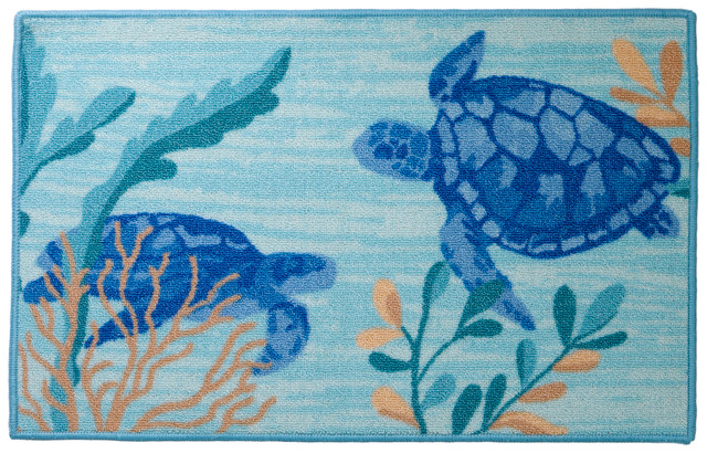 Essential Elements offers rugs perfect to enhance any space in the house. This rug features 2 Turtles swimming background. Measures approximately 17''L x 28''W.