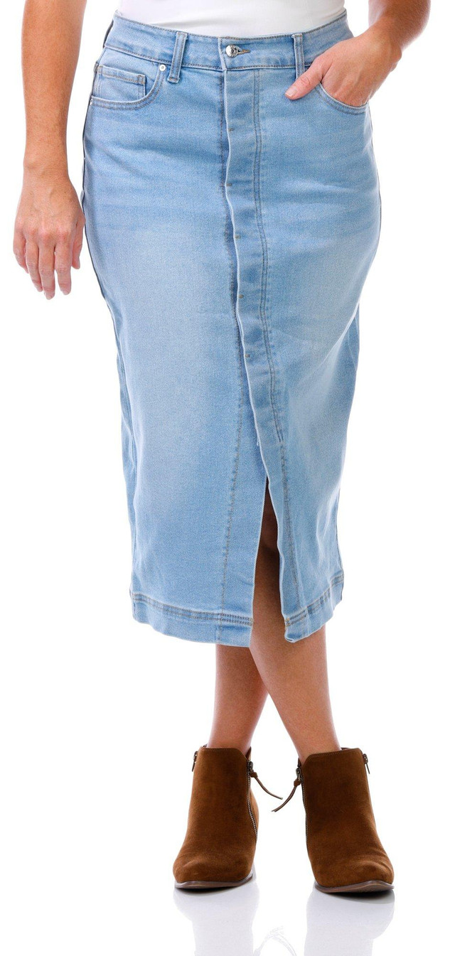 This 31 inch denim midi skirt blends timeless style with a touch of edge Classic 5 pocket design meets a front button closure and a bold front slit for movement and attitude The length offers coverage while keeping your look sharp Made from sturdy denim this skirt is built to flatter and made to last