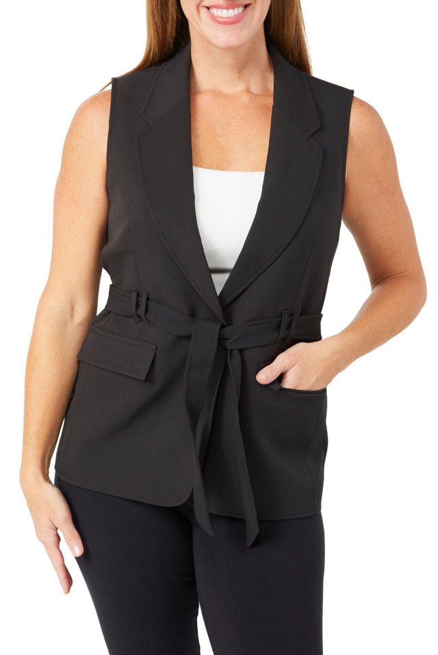 Refine your look with the Women's Belt Suiting Vest. Featuring a solid color, notch collar, single button front closure, and a waist tie for a tailored fit, this vest is finished with front flap pockets. Fabrication 95% polyester, 5% spandex