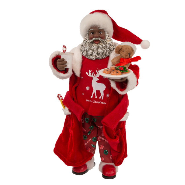 This 10.5-Inch Fabriché African American Santa in Pajamas and Robe is a unique and festive holiday decoration that is sure to bring joy to any home. This charming figurine features a jolly Black Santa Claus dressed in a cozy pair of pajamas and a matching robe. The Santa figure is crafted from high-quality materials and has intricate details, making him the perfect addition to any holiday display. Measures 14 in. x 5 in. x 10.5 in.