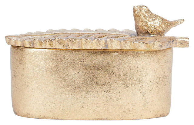 Add elegance and whimsy to your space with this golden container, topped with a sculpted leaf lid and a delicate bird perched in quiet charm. Perfect for holding small treasures, jewelry, or keepsakes, it brings nature-inspired beauty to any counter, dresser, or display shelf. A graceful blend of function and decor that catches the eye and warms the room.