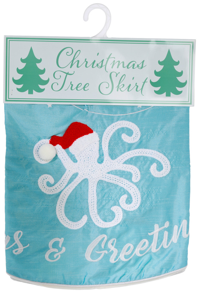 Add nautical flair to your holiday décor with the 42-inch Octopus Tree Skirt. Featuring a whimsical octopus design and the cheerful message Seas and Greetings, this tree skirt brings coastal charm to your Christmas setup. Its unique theme makes it a standout piece under any tree, perfect for beach lovers and ocean-inspired homes.