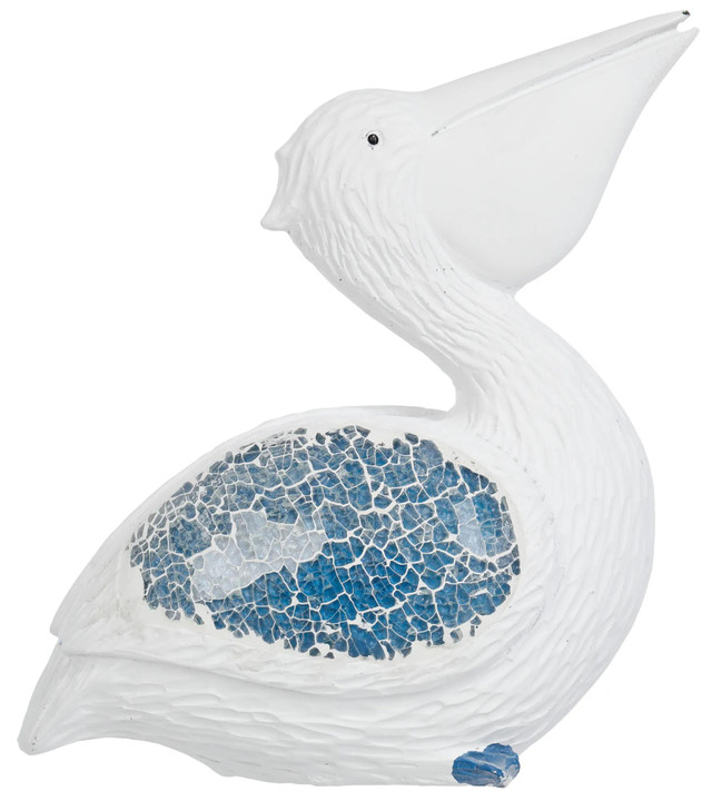 Introducing the Mosaic Sitting Pelican Figurine, a unique and stunning addition to your home. This beautifully crafted figurine features a sitting pelican with intricate blue mosaic details on the wing and a lifelike design, capturing the essence of this majestic bird. Perfect for adding a touch of avian beauty to any room, its compact size makes it a versatile and eye-catching piece. Measure approximately 9 in.