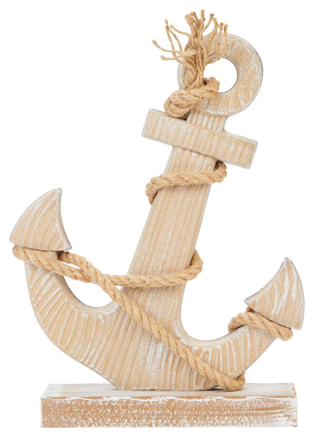 This wood composite sign shaped like an anchor features rope decoration and a sturdy base, bringing nautical charm and coastal style to any space. Measures approximately 12.5 in x 9 in.