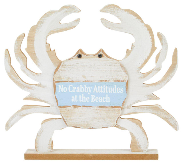This wood composite sign shaped like a crab features playful No Crabby Attitudes at the Beach script, set on a sturdy base for easy display in coastal inspired spaces. Measures approximately 12 in. x 13 in.