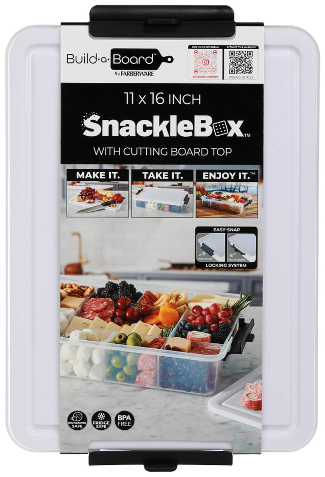 Take your snacking to the next level with the 16 in Snackle Box with Cutting Board, perfect for entertaining or enjoying on-the-go. Featuring 11 compartments, this food storage box keeps a variety of snacks neatly organized and easily accessible. The sleek, modern cutting board doubles as a lid. This versatile snack box makes it easy to make it, take it, and enjoy it anywhere life takes you. Measures approximately 11 in x 16 in x 3 in.