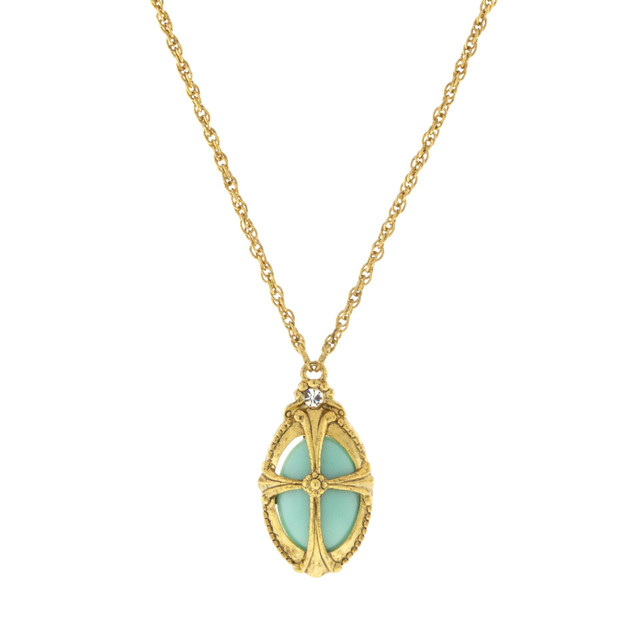 Discover elegance with this faith-inspired necklace, featuring an imitation turquoise cabochon-style stone encased in a 14K gold-dipped frame. The cross enclosure with an embedded crystal adds a touch of sophistication and inspiration. Perfect for contemporary style, this necklace is an elegant and unique piece, ideal for adding a meaningful touch to any outfit. Length 20 in., width 12mm.