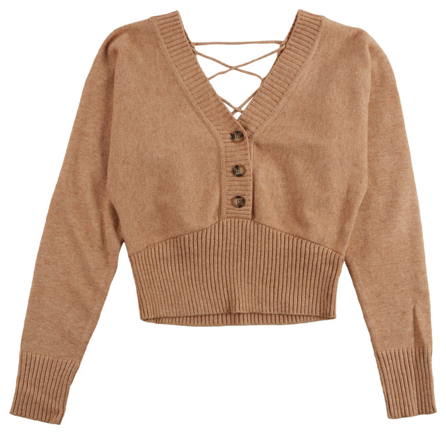 This juniors sweater features a lace up back with a button down front, long sleeves, and warm material. The solid color design offers cozy comfort and stylish versatility for cooler days. Fabrication is 50% rayon, 30% polyester, and 20% nylon.