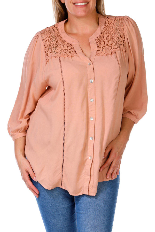 Graceful and timeless, this 3/4 Sleeve Top features delicate lace accents that add a touch of romance to your everyday look. With button down design for comfort and coverage, it offers a flattering silhouette with just the right amount of elegance. Perfect for dressing up denim or pairing with tailored pieces. Fabrication is 80% rayon, 20% linen
