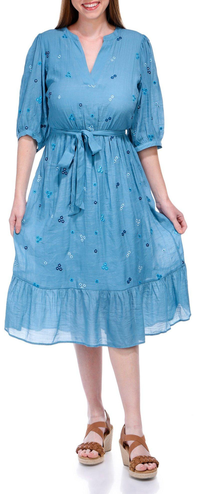 Introducing the Women's Embroidered Floral Midi Dress, crafted from a blend of rayon and polyester. This elegant dress features a beautiful embroidered floral design, 3/4 sleeves, and a flattering v-neckline. With a waist tie and a 43-inch length, it offers both style and comfort. Perfect for any occasion, this dress combines beauty and ease, making it a standout addition to your wardrobe. 65% rayon, 35% polyester
