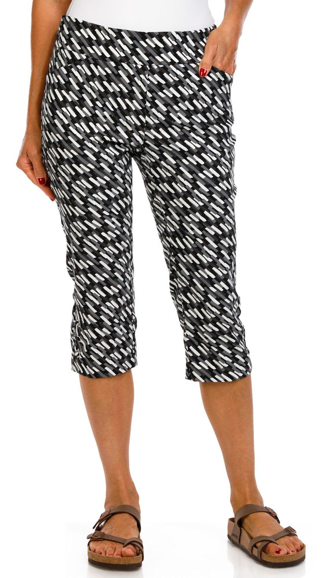 Step into effortless style with these Rhinestone Grommet Hem Capris. Crafted from a soft, stretchy blend of rayon, nylon, and spandex, they feature a pull-on waistband, front pockets, chic print, and chic grommet accents at the hem, perfect for polished, everyday wear.