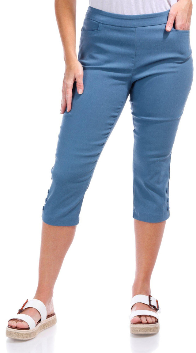 Stay polished and comfortable in these Petite Solid Snap Button Hem Capris. Made from a smooth, stretchy blend of nylon, rayon, and spandex, they feature a pull-on waistband, front pockets, a sleek solid color, and stylish snap button accents at the hemperfect for versatile, everyday wear.