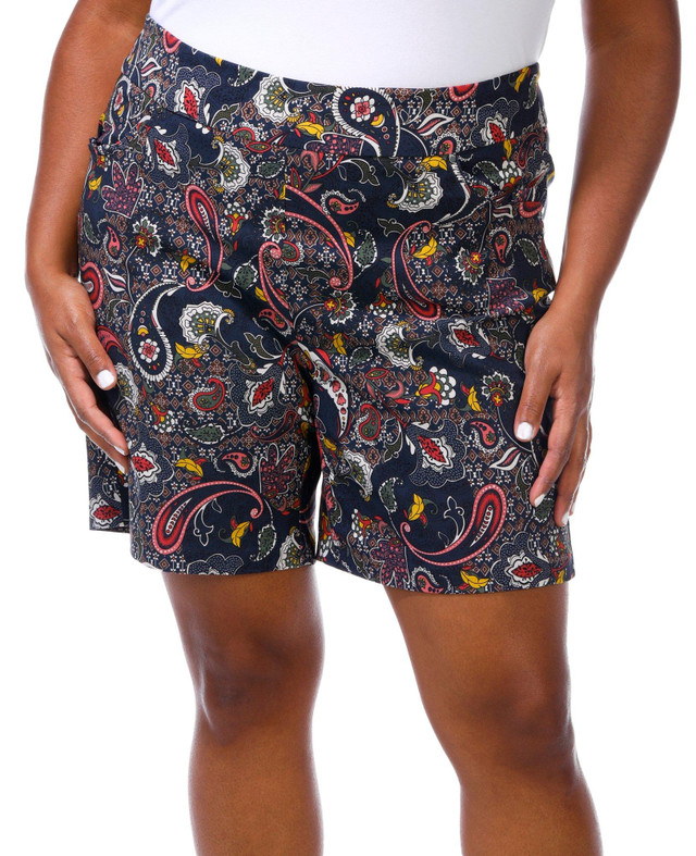 These shorts feature a stylish paisley print, pull on waistband, front pockets, and a 7 inch inseam. Ruffle pocket details add a playful touch, making them a fun and comfortable choice for warm weather days. Fabrication 77% rayon, 20% nylon, 3% spandex.