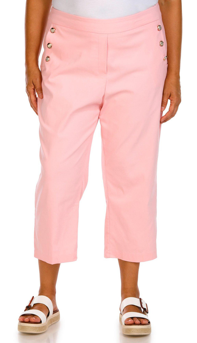 These sailor capri pants feature a solid color with a pull on waistband and gold button accents. The capri length and nautical inspired details offer a stylish and comfortable look for warm weather days. Fabrication 77% rayon, 20% nylon, 3% spandex