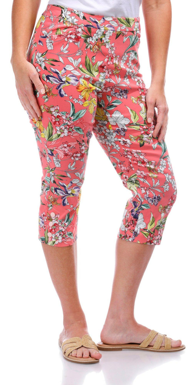 Stay polished and comfortable in these Womens Floral Snap Button Hem Capris. Made from a smooth, stretchy blend of nylon, rayon, and spandex, they feature a pull-on waistband, front pockets, fun floral print, and stylish snap button accents at the hemperfect for versatile, everyday wear.