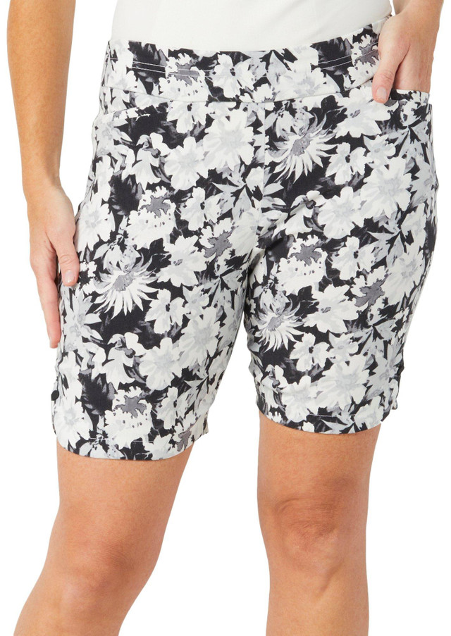 Add a pop of personality to your wardrobe with these printed Bermuda shorts, featuring snap button hem details and double front pockets for a touch of utility charm. The bold pattern brings playful energy, while the tailored fit keeps things polished. Fabrication is 77% rayon, 20% nylon, 3% spandex.