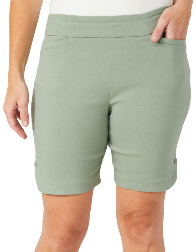 Step up your casual game with these solid color Bermuda shorts, featuring snap button hem details and double front pockets for a touch of utility inspired flair. The tailored length offers a polished yet relaxed fit, making them perfect for sunny days, weekend outings, or laid back office looks. Fabrication is 77% rayon, 20% nylon, 3% spandex.