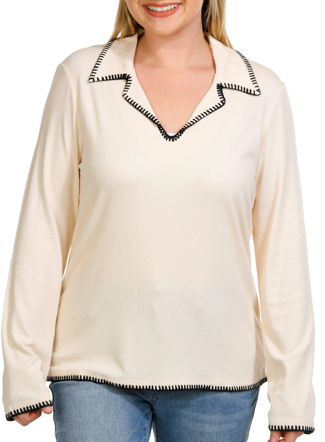 The Women's Parker Ribbed Blanket Stitch Top is a chic and comfortable addition to any wardrobe. Crafted from a blend of cotton, polyester, and rayon, this top features a stylish solid ribbed exterior. The johnny collar adds a unique touch, while the stitch detail on the collar and hem enhances its trendy appeal. With long sleeves, it's perfect for layering or wearing on its own for a polished yet relaxed look.