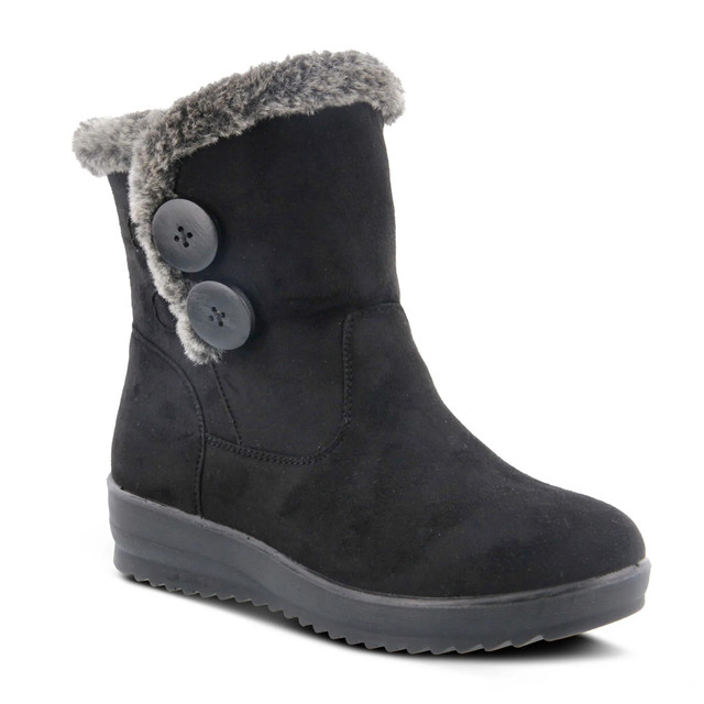Stay warm and stylish with the Flexus Istra Boot, crafted from waterproof micro-suede and vegan-friendly materials. Featuring a cozy faux fur collar, two large decorative buttons with stretchable bungee cords, and a flexible, lightweight outsole, this round-toe bootie offers plush comfort and everyday wearability. Perfect for cold weather with a soft faux fur lining and insole.