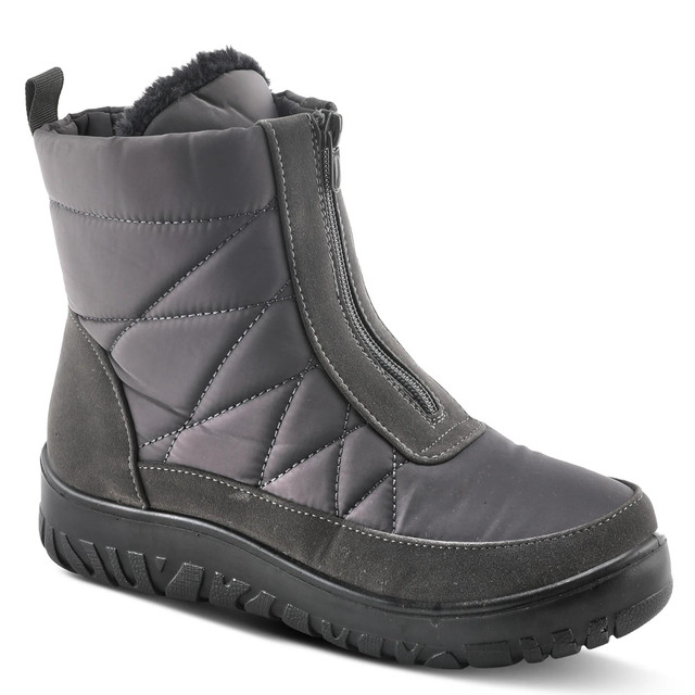 Conquer winter in the Flexus Lakeeffect Mid-Calf Boots. Designed with a classic quilted upper, waterproof protection, and warm faux fur lining, this boot features a front zipper and fold-out metal ice grip for added traction. The flexible sole and extra-treaded outsole ensure comfort and stability in snow and ice. Cozy, stylish, and built for cold-weather adventures.